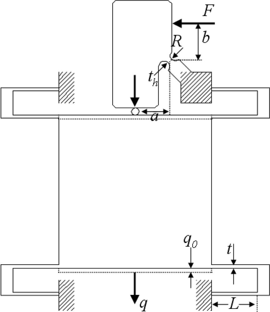 For the model, the z-scanner is simplified as shown in Figure 2. F is a force exerted by the PZT actuator; R, th, and wh are the radius, thickness, and depth (width) of the rotational hinge, respectively; L, t, and w are the length, thickness, and depth (width) of the flexure guide; and q and q0 are displacement and initial preload of the moving body, respectively.