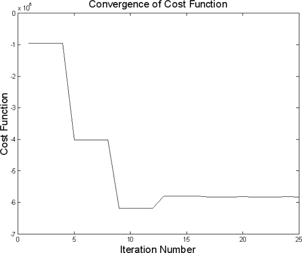 Using the sequential quadratic programming (SQP) method of MATLAB® Optimization Toolbox™ (The MathWorks), the convergence plot after completion of the optimization process was determined as shown in Figure 3.