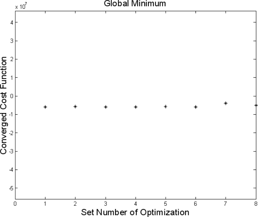 To ensure a global minimum value, eight optimization processes with random initial values were performed as shown in Figure 4. The optimized values are summarized as shown in Table 2.