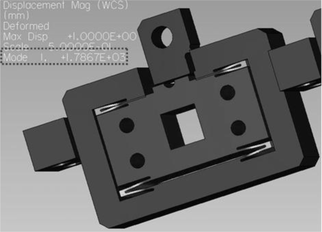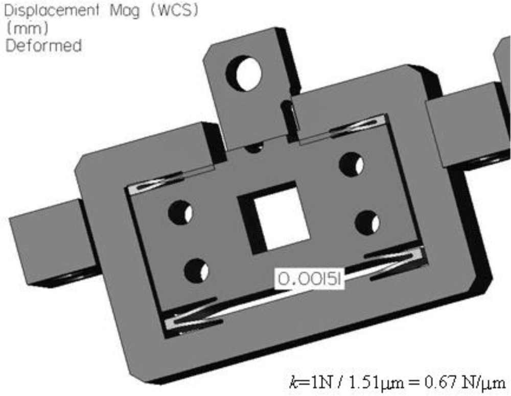 To validate the optimal design, finite element analyses using the commercial program Pro/ENGINEER Mechanica™ were performed, and the results are shown in Figure 5 and Figure 6. The stiffness simulation result is shown in Figure 5 and the first resonant frequency is shown in Figure 6. The comparison between the optimal design and the FEA results are summarized in Table 3. The difference is within 10%, which is acceptable. If the total moving mass, including the optical lever, is considered in the calculation of the resonant frequency, the final resonant frequency is 2.1 kHz.