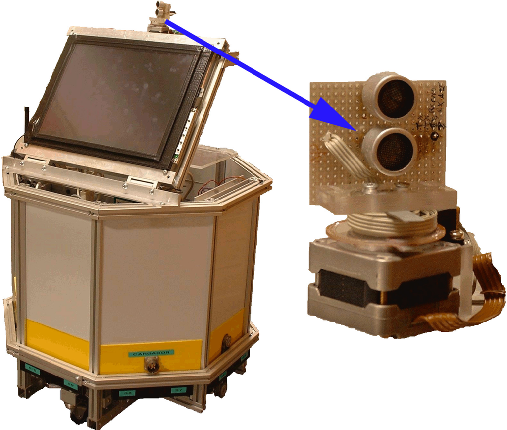 In our experiments we used the robot YAIR [24]. Figure 1 shows this robot together with the rotary ultrasonic sensor on its top. The sensor has two transducers: one transmitter and one receiver, enabling the two transducers to have the same rotating axis. This rotating array is driven by a stepper motor with 1.8 degrees per step, and is able to get up to 200 angular samples in each scan. In each angular position, the transmitter sends a train of 16 ultrasonic pulses and normally up to 256 samples of this signal are recorded before the stepper motor advances to the next position, repeating the process. Thus, in each angular position a vector of 256 samples is stored and processed, and the complete scan will produce an array of 200 angular echoes. It should be taken into account that for each angular position the amplitude of the ultrasonic echo is available and subsequently, information about the situation of obstacles can be calculated later by using the TOF method.
