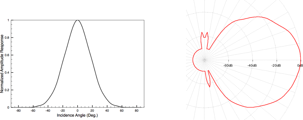 Also, it must be noted that ultrasonic sensors usually have relatively wide sensitivity cones. This means that obstacles separated up to an angle θ0 from frontal orientation of the sensor can produce appreciable peak amplitudes in the received echo. In the case of the piezo-ceramic transducers used in our work, this angle θ0 is about 55°. In Figure 2 the angular amplitude response of our ultrasonic transducer is shown, presented both in linear (left) and polar (right) plots. These two plots show us that a single object will produce an amplitude peak corresponding to the distance from this object to the sensor during 110 degrees of rotation of the sensor. Of course, the maximum value of these registered peaks will correspond with the frontal orientation between transducers and object.