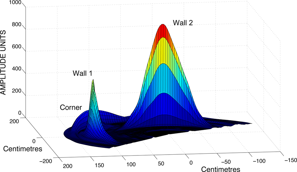 This case occurs typically when a squared pillar protrudes slightly from a wall. This corner is produced by a big wall (main wall) and a little wall (one of the sides of the pillar). In this situation usually only one “ghost peak” can be observed in the corner’s echo, as is evident from Figure 7. In general, when one of the two walls are not within the field of view of the transducers, the echo of their corner will miss the corresponding “ghost peak”.