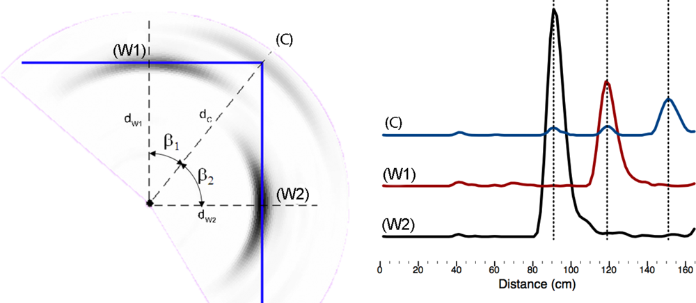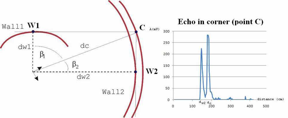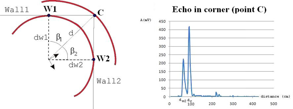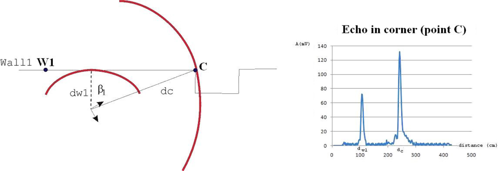 If any of the angles β1 or β2 exceeds value β0 = 55° then there is no appreciable wall echo from its corner, as shown in Figure 5. The echo in the corner has only a “ghost peak”.