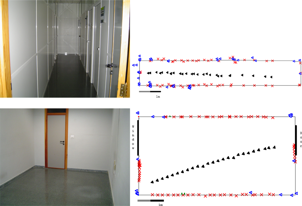 Data set 2. The scenarios were composed of different kinds of materials in the corners. Walls were mainly made of pladur®, some pillars of cement (Cr = 0.59) and pladur®, a door of laminated material (Cr = 0.64) with wood doorframes (Cr = 0.5), and some metal downspout frames (Cr = 0.5), and glass windows (Cr = 0.71).