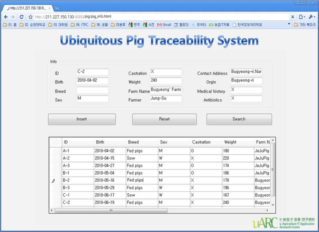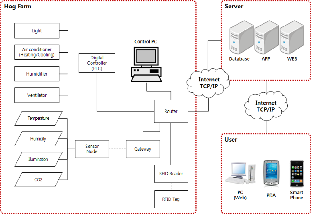 In addition, hog farm facilities could be automatically controlled based on some breeding environment value which is already set up and SMS notice service shall be provided to users when dangerous situation occur, while RFID technology enables users to collect each pig’s identification and individual information for their efficient history management.
