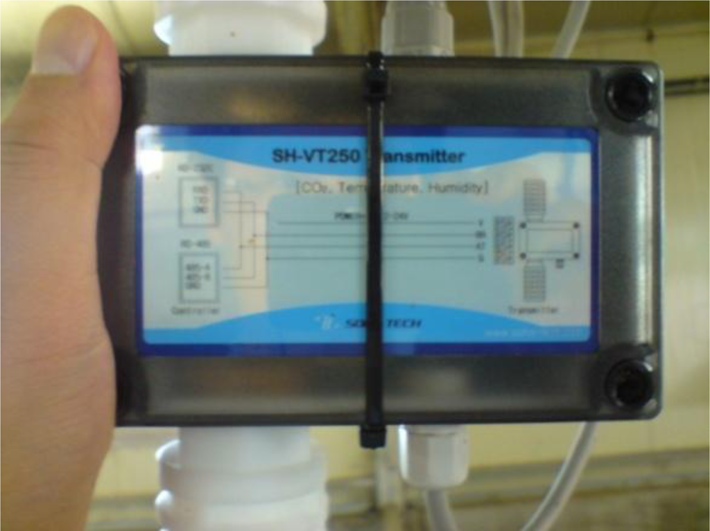 In addition, since the environmental sensors of the hog farm may provide wrong information about the hog farm, we compare it to environmental information values obtained from wired sensors which were installed in the hog farm too. The wired sensors can measure CO2, temperature and humidity, etc., For this NDIR CO2 Dual Sensor type sensors are used so no calibration is necessary for long periods and RS-485 is used as the communication method. Figure 11 and Table 2 show the hardware types and specifications of the wired sensors installed at the hog farm.