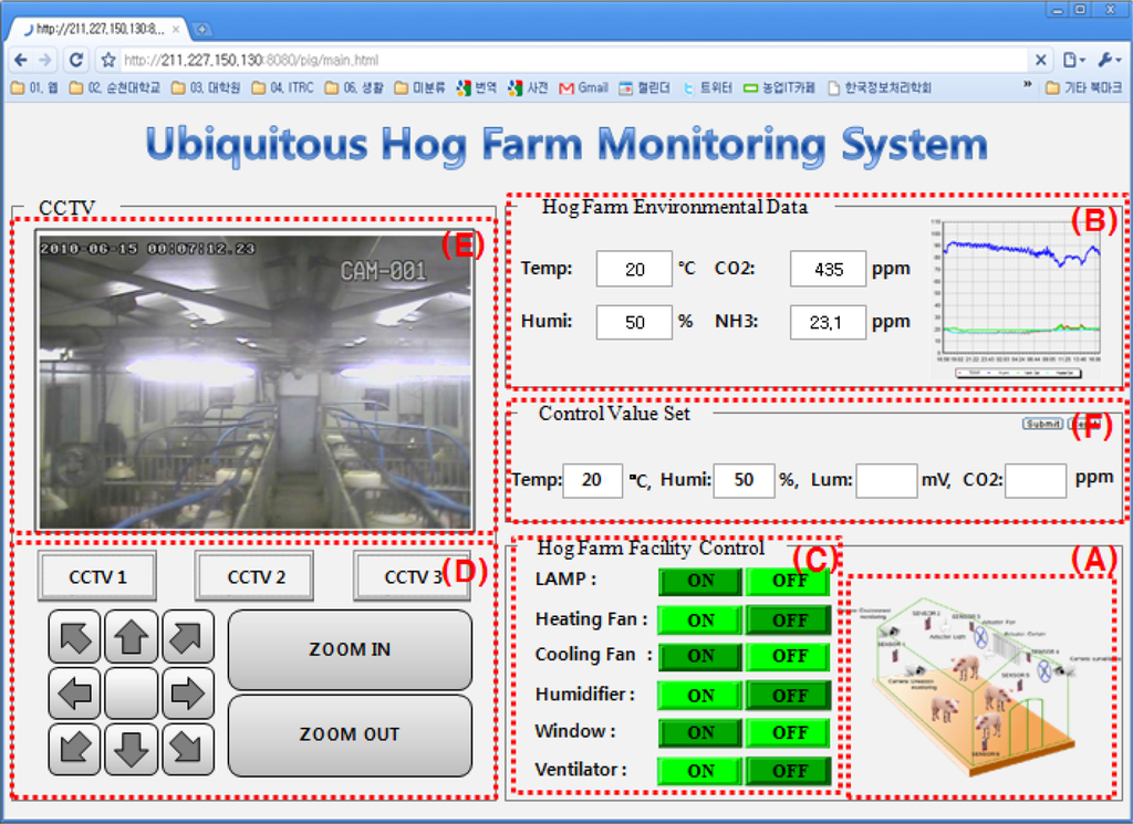 Figure 15 illustrates the Web GUI for the hog farm management system which allows monitoring and controlling the the hog farm facility. In the GUI for the manager, the sensing values which are measured at the sensors installed inside and outside the hog farm appear in ⓑ, and ⓒ shows the control status of equipment at the hog farm and its conditions. ⓐ expresses the conditions of equipment in ⓒ as graphics. ⓓ is the part to control the CCTV stsme, ⓔ is the part to show the collected images through the CCTV, and ⓕ the part to enter standard values for automatic hog farm control.
