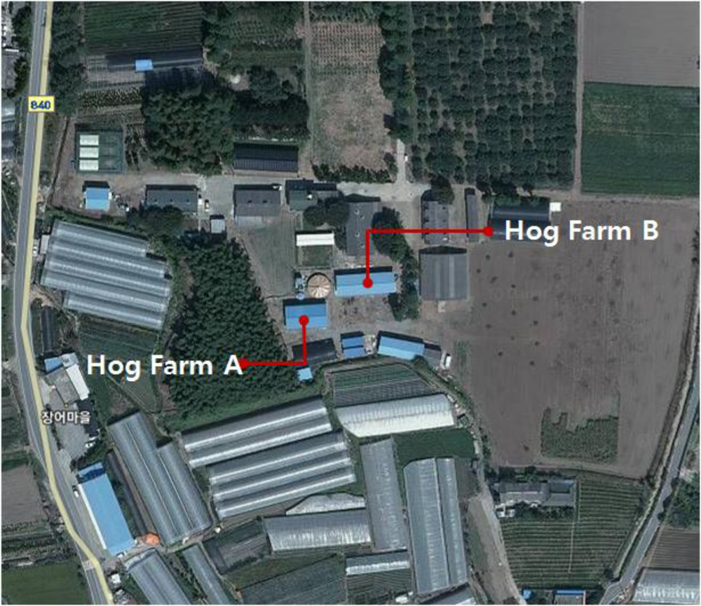 Test beds were established at two hog farms located at the sites shown in Figure 17 in order to assess the proposed system. Wired sensors and the WSN were formed at hog farm A while wired sensors, WSN and the proposed ubiquitous hog farm system were installed at hog farm B. Both farms are located in the same area within 5 m distance.