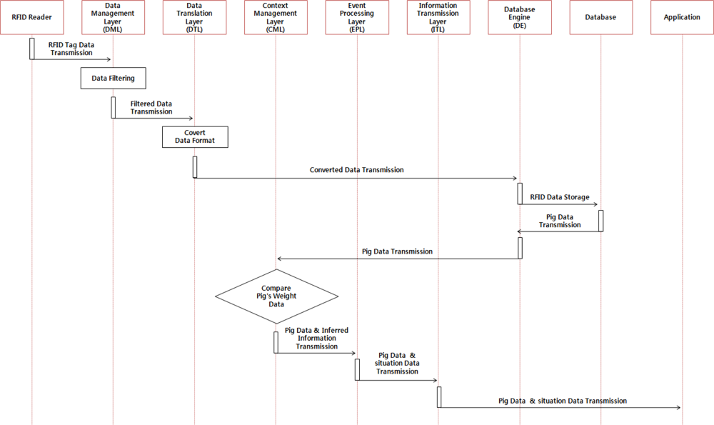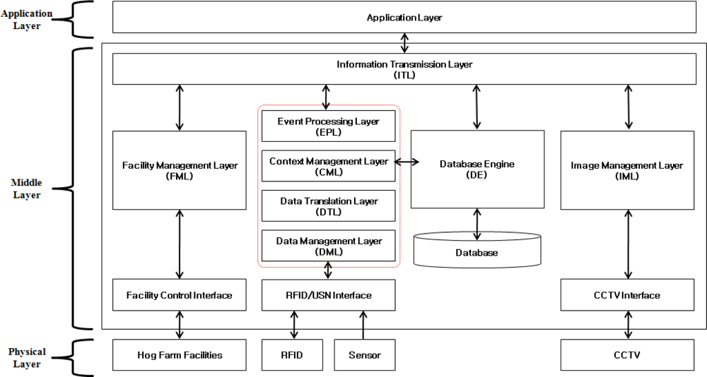 The middle layer has features to collect data occurring in the physical layer such as sensors installed for monitoring the hog farm environment, RFID for managing information of each pig’s identification and individual history, and to lower the load on the application programs by filtering real time information and provide data requested by the application programs.
