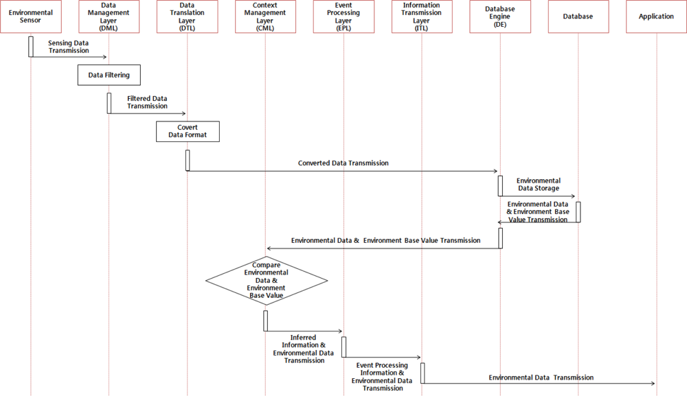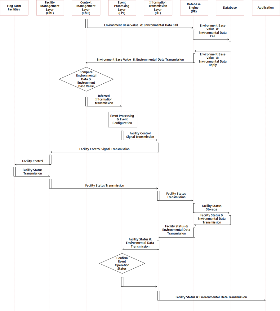 When examining the detailed operation process of the hog farm environment monitoring service, environmental sensors installed at the hog farm collect the environmental data of the farm and deliver it regularly to the DML. Then the DML delivers valid messages to the DTL after filtering the collected information, and the DTL converts the filtered information to a data format suitable for use in the application program(s). The converted data shall be saved into the database through the DE and delivered to the application layer via the CML and EPL so that a user can monitor the hog farm’s environmental information. Figure 3 below illustrates the operation of the hog farm environment monitoring service.