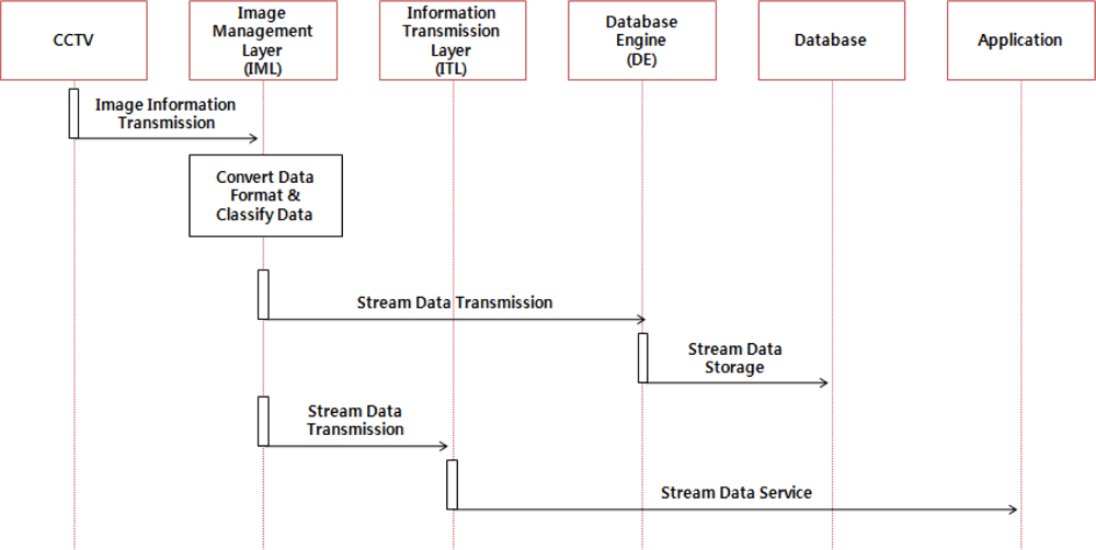 In addition, the image monitoring service of the hog farm collects image information from the CCTV system installed in the hog farm and transmits it to the IML, which provides the application layer with a stream of data and stores it in the database via the DE after classifying the stream of data according to the hog farm ID and camera number. Figure 4 shows the operation process of the hog farm image monitoring service.
