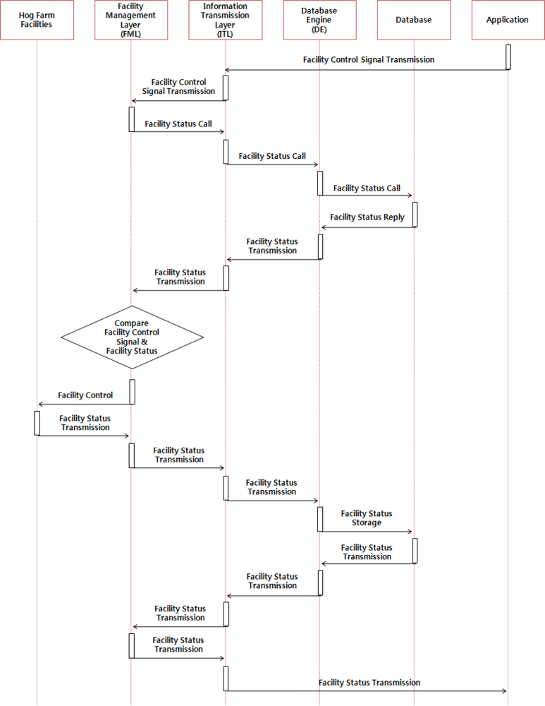 The manual control service is a service which supports users when they would like to control the the hog farm facility after checking the hog farm information such as breeding environment information, external environment information, image information of the hog farm, etc. When users transmit a control signal to the FML via the GUI and ITL, the FML then checks the operation of the facility stored in the database via DE and converts the transmitted control signal from the application layer to the proper typed data format and transmits it to the control facility of the hog farm. Figure 6 illustrates the operation of the manual control service of the hog farm.