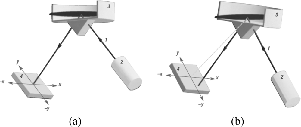 In the design of the sensor, the horizon (tilt-sensitive element) is provided by a liquid in a closed container. The liquid’s surface is perpendicular to the vertical, independent of the sensor’s orientation. The inclination of the horizon relative to the sensor is measured by opto-electronic means. All the optical components used in the sensor are fastened to the underside of a flat glass plate. The plate also forms the bottom of the container with the transparent liquid. Through opto-electronic components, the luminous surface of a Light-Emitting Diode (LED) is imaged on a position-sensitive photodiode. The light from the LED is guided from below through the flat glass and the liquid, is totally reflected at the liquid’s surface, and then passes again through the liquid and the flat glass. Finally, the photodiode detects the position of the impinging light spot relative to the origin, which was adjusted and calibrated precisely in the horizontal configuration of the sensor (see Figure 1) [].