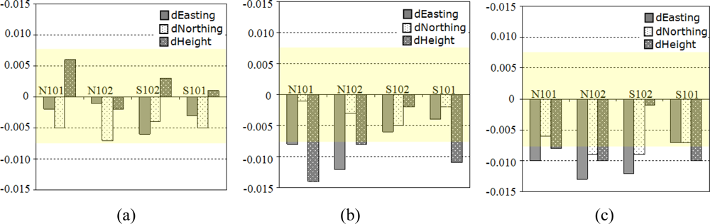 Easting, northing, and height differences of the N102, N101, S102, and S101 deformation points are shown in Figure 10. In the graphs, no significant movement can be seen between the first and the second campaigns. However, between the second and the third campaigns, significant changes of less than 1.5 cm are recorded in the easting of N101 and in the heights of N102 and S101. In the time between the first and third campaigns, significant changes are seen in the easting components of N101, N102, and S102. The only change in the easting of N102 is less than 1 cm. In the heights of N101 and S101, a 1-cm change is also found to be significant.