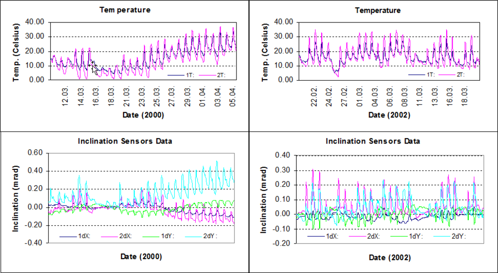 According to the corresponding temperature graphs and the observer reports, the weather conditions seemed to be generally stable during both campaigns. In observations in the year 2000, the temperature varied between 5 °C and 32 °C, with a 2 °C difference between the two sensors on any given day and increasing to 7 °C at nights. After the 14th observation day, the average daily temperature increased, and this appeared to also affect the inclinations of the pillar (see the trend of inclination data, especially of the 2nd sensor, after the 14th day of observations in Figure 11). In 2002, the temperatures varied between 3 °C and 35 °C. The daily averages appeared to be consistent throughout the campaign. However, it should be noted that the temperatures measured are the values inside the plastic hoods.