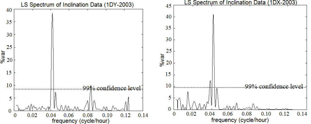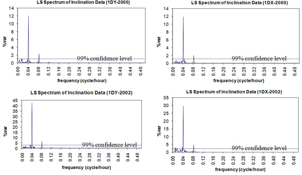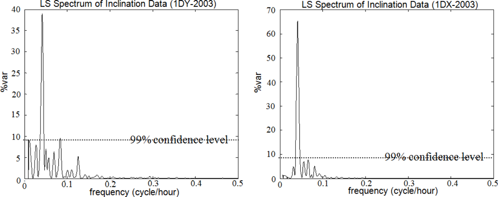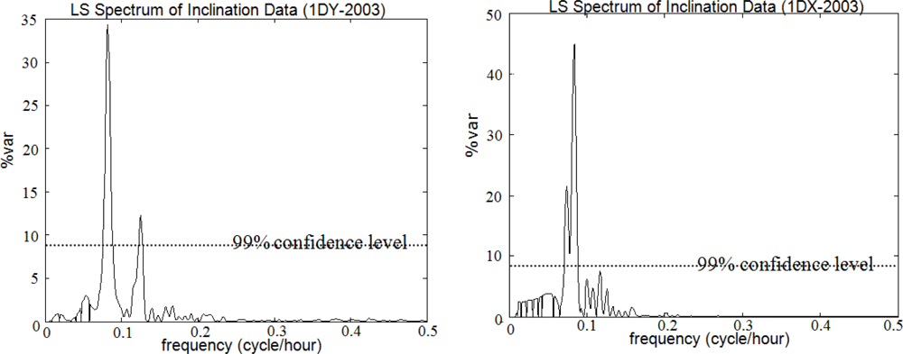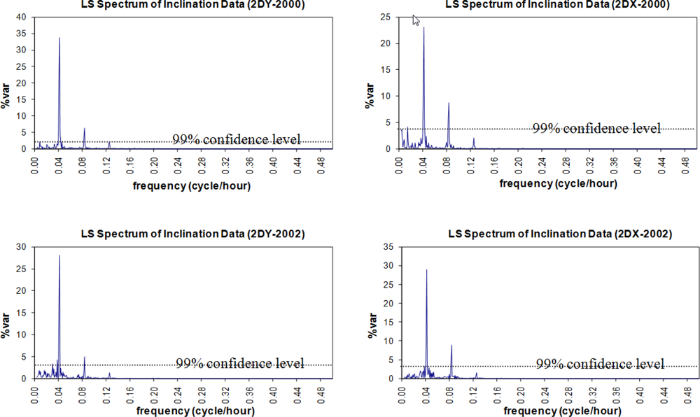 In spectral analysis results of the inclinations, the hidden periodicities of the movements of the pillar and the building that hosts the pillar were clarified. The data analysis for the year 2000 yields the fact that both the pillar and the building seemed to have similar characters of movement as they did in 2002. In the overall results, the significant peaks with T = 12 h and T = 24 h were identified in the signals by Sensors I and II along the north-south (X-axis) and east-west (Y-axis) directions. The graphs in Figures 12 and 13 verify these conclusions.