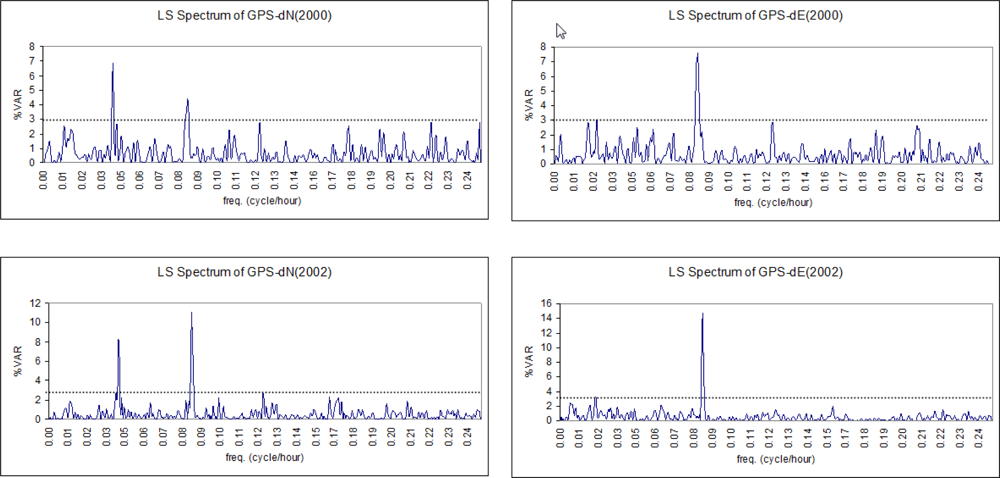 The time series obtained from the inclinometers and continuous GPS data were processed using the Least Squares Spectral Analysis (LSSA) technique, which is useful for the evaluation of periodic, multi-parameter, and noisy time series that can be decomposed into their component signals [–]. This method is based on the least squares approximation technique, which is closely related to least squares parametric adjustment [,], and it has certain advantages compared to classical Fourier methods, such as overcoming the blindness of former techniques to the existence of sampling irregularities or gaps in the data. It was applied in its original form by [] and [], and alternate forms have been used by a number of researchers in the fields of geodetic science [,,,–], astronomy [,], geophysical applications (e.g., []), mathematics (e.g., []), microbiology (e.g., []), medicine (e.g., []), and finance.
