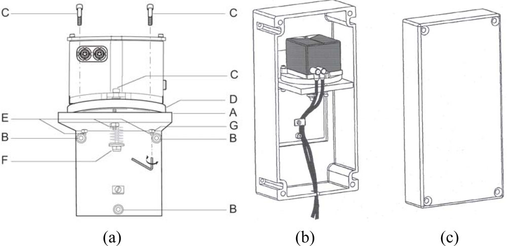 The flat glass plate, serving simultaneously as a component and as the support for the actual sensor element, is clamped onto a trough-shaped metal base. The sensor is set up on three hardened and ground circular support surfaces on the underside of this base. The support surfaces have through holes for the screws in the center. The sensor is covered with a plastic hood that serves primarily as a thermal insulator, which is meant to prevent external heat effects from causing non-uniform thermal expansion in the interior of the sensor and consequent measuring errors (see Figures 2(b) and (c)). A temperature sensor is also installed to monitor the sensor’s temperature. A bubble level on the sensor allows the operator a rough determination of the horizontal. More precise adjustment of the horizon is done electronically by the help of software before starting measurement with the instrument. The values of inclinations in the X and Y directions (in mrad, mm/m, or arc-min) and the temperature (in °C) are available as measurement values, and the observed data is visualized and stored using commercial software in a terminal computer. The inclinometer has an RS-232 or RS-485 serial interface, the latter of which has the capability of operating up to thirty-two sensors on the same network. Some specifications of the measuring capacity of the sensor are summarized in Table 1 [].