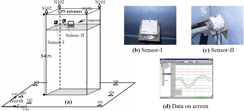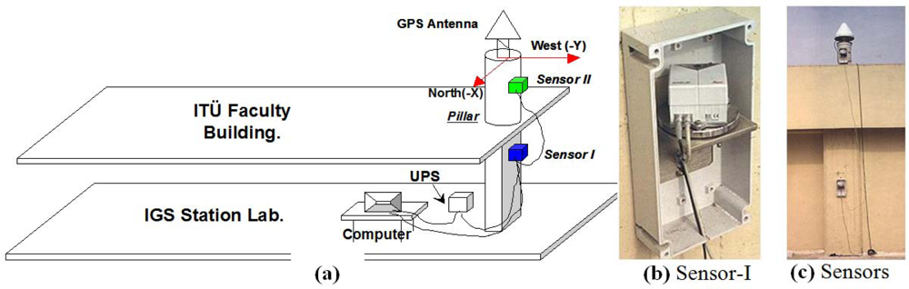 Today, inclination sensors are often part of measurement systems that are used in static and kinematic applications of many disciplines, such as measuring the inclination of land or platforms to build upon, in aircraft flight systems, vehicle security systems, volcano monitoring, precise farming etc. [,]. However, the studies are not many on the performance assessments of precise inclinometers and their use alongside other techniques for structural monitoring. In this study, a pair of inclination sensors of micro-radian precision were used alongside GPS for monitoring and determining the movements of a tall building and a geodetic monument (International GNSS Service-IGS continuous reference GPS station pillar), both located in Istanbul to the north of the North Anatolian Fault (NAF) [–]. Explaining merits and limitations of inclination sensors by comparing them to static and continuous GPS observations in deformation monitoring based on the drawn results of the case studies is purposed. The followed strategy and methodology for analyzing the deformations of case objects may constitute an example to the similar investigations.