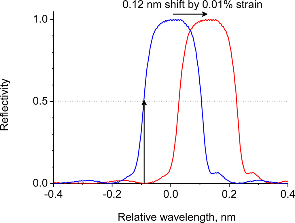The first term, dR/dλ, is the slope of the FBG reflection spectrum at the lasing wavelength. This value can be assessed from the reflection spectrum, as measured with an optical spectrum analyzer. The second term, dλ/dε, is the strain sensitivity of the Bragg wavelength shift and is given as 1.2 pm/με for a 1.55 μm Bragg grating.