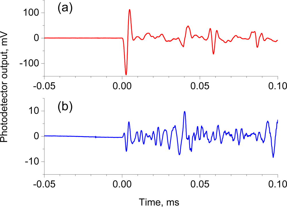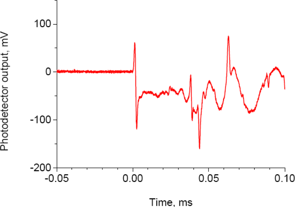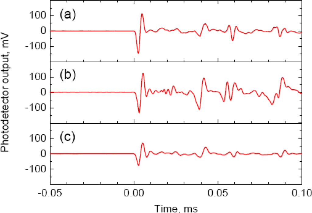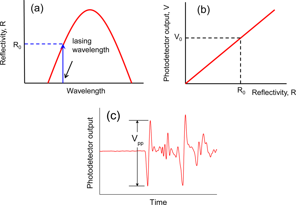 As the photodetector output varies in proportion to the reflectivity at the lasing wavelength, as shown in Figure 7(b), the photodetector output as a function of time, V(t), is given by Equation (3):