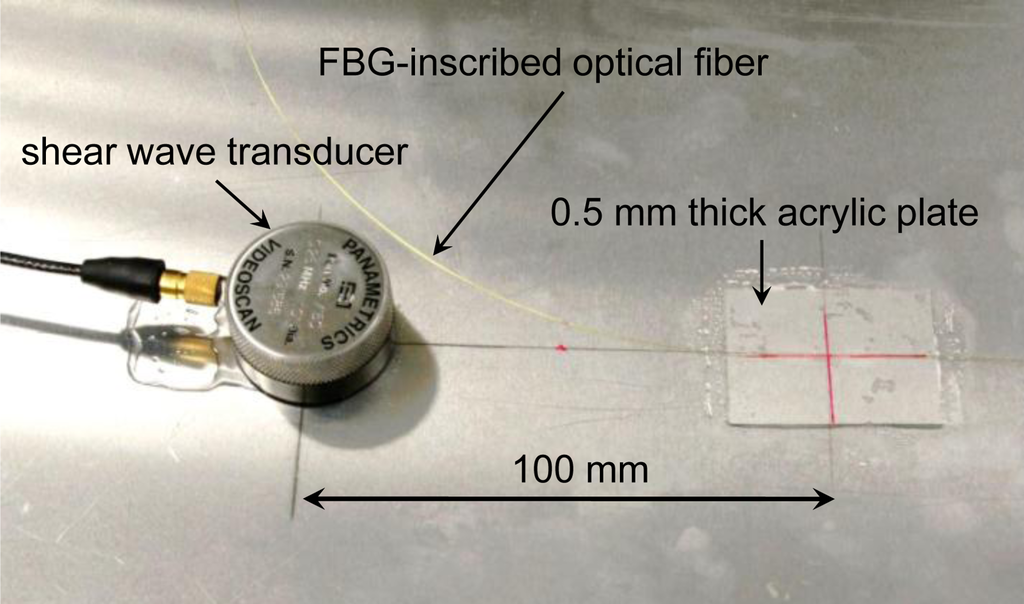 Figure 4 shows the experimental setup for the glued FBG sensor and the FBG contact-free sensor. Figure 5 shows the experimental setup for the mobile FBG sensor. The distance between the FBG and the ultrasound transducer was 100 mm for the glued and mobile FBG sensors. The span between the FBG and the ultrasound transducer was 150 mm for the FBG contact-free sensor because the FBG was 50 mm away from the glued part of the optical fiber. The S0 wave was generated by a shear wave transducer (Panametrics, V150) using a 375-V pulse (peak voltage).