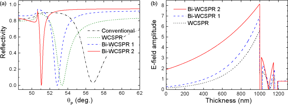 Figure 2(a) shows the SPR reflectivity curves calculated as a function of incident angle, θP, in the incident medium of the SF10 prism for several model stacks. The optimum thickness of ZnS-SiO2 waveguide was determined to be 131 nm for all three WCSPR configurations. The complex refractive indices of Au and Ag used are 0.2184 + 3.5113i and 0.082 + 4.1563i, respectively. The reflectivity curve labeled as WCSPR represents the case where both the inner- and outer-metal layers are composed of Au and have respective thicknesses of 35 and 28 nm. Bi-WCSPR1 configuration has the multilayer stack of SF10 prism/Ag(35 nm)/ZnS-SiO2/Au(28 nm)/water buffer, the same as that of the WCSPR, except that the inner Au layer was replaced by Ag. Bi-WCSPR2 represents the case of increased ratio of Ag to Au, i.e., 42 nm to 16 nm. A conventional SPR using a single Au layer of 50 nm thickness was also included for comparison.