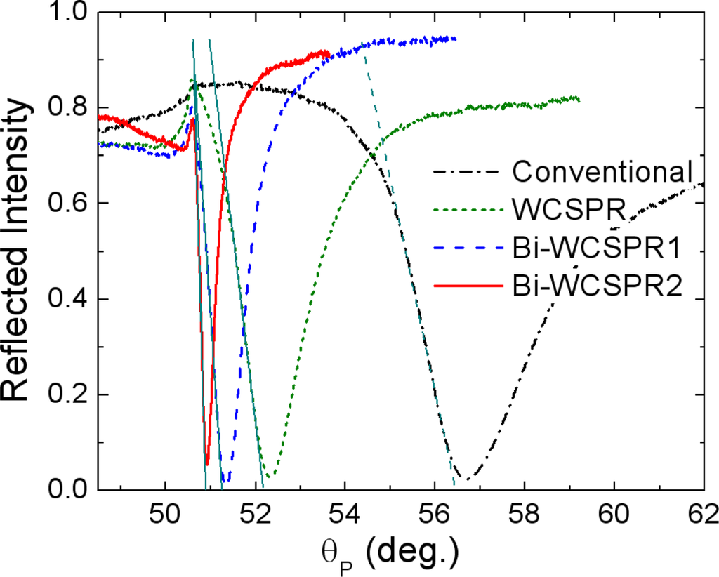 As confirmed in Figure 3, it is clear that the use of inner Ag layer instead of Au further enhances the sharpness of the WCSPR. Especially, the reflectivity curve of Bi-WCSPR2 is 7.68 times steeper (dR/dθP = 3.4266/°) when evaluated by the slope of linear portion of dip curve at low angle side and 9.62 times narrower in full width at half maximum (FWHM = 0.3483°) than those of conventional SPR (dR/dθP = 0.4463/°, FWHM = 3.3508°). Since the operations of a SPR sensor are performed by measuring a change in the reflectance dip curve in response to an environmental refractive index change, the sensing resolution, i.e., the lowest refractive index change detectable is expected to be greatly enhanced due to the drastic reduction in the curve width.