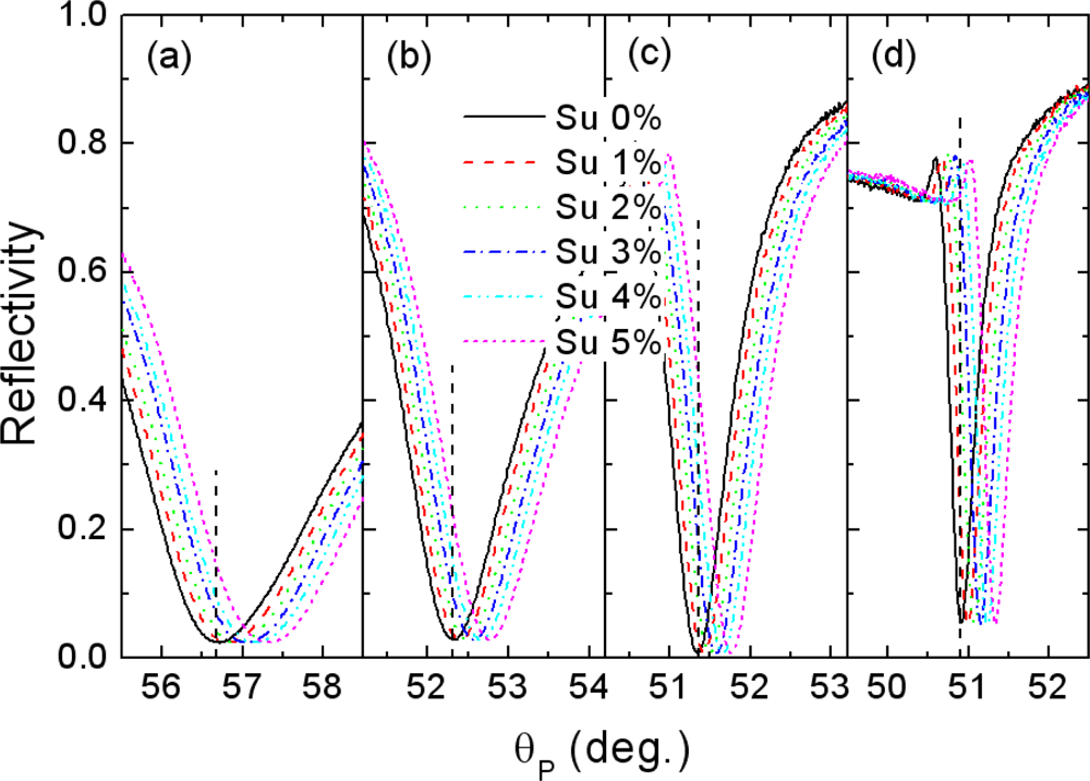 Figure 3 shows the experimental reflectivity curves measured for the SPR configurations fabricated on the SF10 prism base using the geometrical parameters described above. The sequential stacks of the inner Ag (or Au) layer, the ZnS-SiO2 dielectric waveguide, and the outer Au layer are deposited at room temperature by RF magnetron sputtering. The overall profiles seem to be in good accordance with the simulation results. Some discrepancies observed might be ascribed to the uncertainty in refractive indices of thin metal layers and the thickness variation of constituent layers.