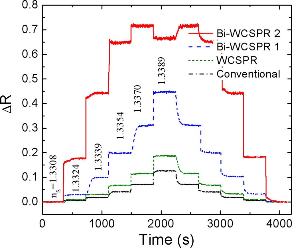 Figure 5 verifies the enhanced response of the present Bi-WCSPR sensors. The temporal responses of the reflected intensity measured at the angle of initial resonance were monitored during a cycle of periodic injection of sucrose solution with a series of concentrations. As expected from Figure 4, the relative change in reflectivity of the Bi-WCSPR configurations is significantly increased, exhibiting much larger ΔR even for a small change in the refractive index of the surrounding medium. Furthermore, the Bi-WCSPR2 undergoes saturation to a total reflection even when the solution concentration exceeds 3 wt%, and exhibits a reflectance of the multilayer stack itself observed below a critical angle. Finally, the staircase responses recover to the initial state as the injected concentration returns back to the pure water.