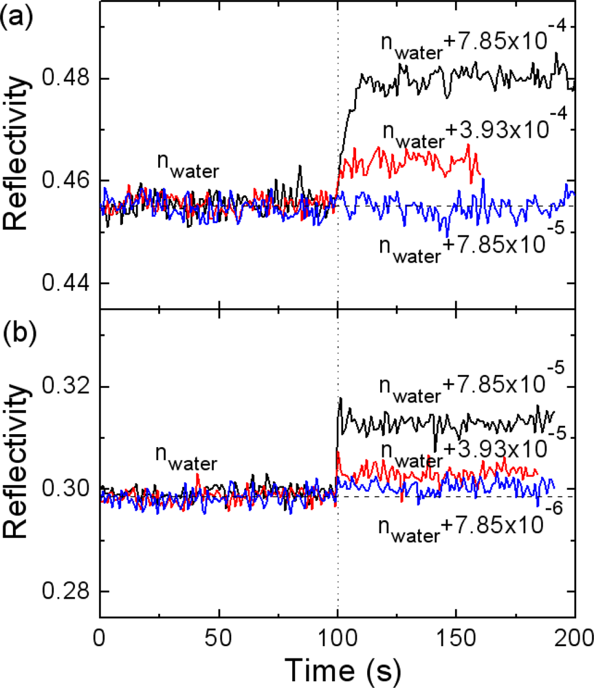 To demonstrate high resolution of the present Bi-WCSPR sensors, we carried out a LOD test as a way of determining the lowest refractive index of dilute sucrose solutions we can resolve from the water base. For this purpose, the temporal responses of the reflected intensity to the injection of dilute sucrose solutions were measured at the angle of highest slope of SPR dip for the Bi-WCSPR2 stack [Figure 6(b)] and compared with that of conventional SPR [Figure 6(a)].