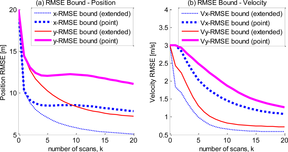 Because the target dynamics are random (with non-zero dynamic noise) in the simulation scenario, the calculation of the measurement contribution using (14) requires the evaluation of the mathematical expectation of with respect to Xk+1. A sampling scheme is used here. From the initial target state and the dynamic model, multiple target state sequences are generated, and the corresponding measurement contribution is computed. The overall measurement contribution is then computed as an average of the measurement contributions conditional on each state sequence. In this simulation, 10,000 state sequences were sampled to approximate the measurement contribution. The comparison of the bounds of target centroid dynamics (position and velocity) using both the extended and point target models is shown in Figure 2. The numerical result also confirms the theoretical development in [7] that the bound of the extended model is always smaller than that of the point model because the three sufficient conditions proposed in [7] are satisfied in the tracking models discussed here. The improvement in the bound of the extended target tracking model is a result of the fact that the measurements of the target extent are directly dependent on the target centroid dynamics (position and velocity). Figure 2(a) shows that the new measurements of the target extent are of relatively small importance for the estimation of target position, especially in the early stage of tracking. However, the PCRLBs of the velocities [as shown in Figure 2(b)] of the extended target model in both the x and y directions decrease sharply upon the arrival of the measurements (the initial values of the FIM of the extended and point models are equivalent). In the conventional point target tracking framework, the velocity is estimated only through the target centroid positions, and the uncertainty of the velocity is not reduced until the second frame of measurements (so the bound of the velocity in the first scan is no less than the initial covariance). However, the information on the target velocity is carried with the target extent measurements in the extended target model. Thus, the uncertainty of the velocity is significantly reduced with the arrival of the first scan of sensor measurements. This advantage could greatly benefit the tracking systems for defense, especially for velocity-sensitive ones, such as anti-missile systems. The early and precise sensing of the target velocity will substantially improve the power of defense surveillance systems.