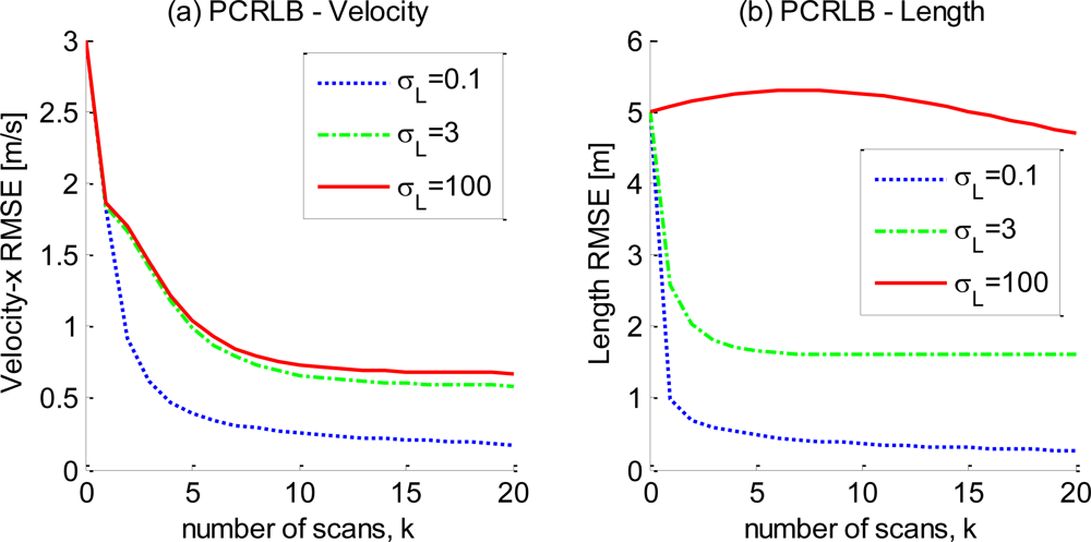 Figure 3 illustrates the PCRLBs of the target velocity (in the direction of the x axis) and target length for different values of σL (the effect of σL on the curves for the target position is negligible and therefore not shown here). In Figure 3, the parameters except σL are set to the same values as before, and the curves of corresponding to σL = 0.1, σL = 3, and σL = 100 are presented. The numerical result unsurprisingly coincides with the intuition that the performance bound is improved by the accurate measurement of the target extent. Furthermore, Figure 3(b) shows that the estimation bound of the target length benefits from the accuracy of the target extent measurement more evidently than that of the target velocity [which is shown in Figure 3(a)] because the relationship between the target length and extent is more direct in this sensor-target geometry (Ø0 = 20°). The influence of the sensor-target geometry on the estimation bound is reported below.