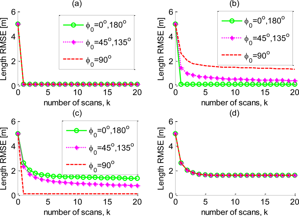 Next, the impact of the VLOS angle on the PCRLB is analyzed. The effect of φ on the estimation bounds of the position and velocity are negligible and not shown, but the impact of φ on the curves for the target length also depends on the accuracy of the target extent measurements. Figure 4 shows the curves for the initial VLOS angles Ø0 = 0°, 45°, and 90° for four combinations of the values of σL and σW (corresponding to the case of good and poor accuracy in the measurement of the down-range/cross-range extent).