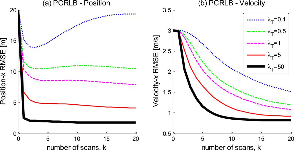 In the simulation, the sensor is also static and at the origin of the coordinate system, while the target moves with initial velocity (vx0, vy0) = (10, 15) starting from the initial position (15000,10000). The initial FIM is J0 = {[diag (20, 3, 20, 3)]−2}−1. The covariance of the state noise is Qk = diag (3, 0.1, 3, 0.1), and the measurement noise is zero-mean white Gaussian noise with standard deviations of σρ = 5 and σθ = 0.1°. The mean number of measurements per frame is λT = 2.5, and the time interval is T = 1. All the parameter units are in the metric system. The estimation bounds calculated by the EIRF approach for the position and velocity along both the x and y axes are shown in Figure 5. Equation (28) indicates that the estimation performance bound is affected by the number of measurements originating from the target. In the EIRF methodology, the overall impact is manifested as a constant scalar, the mean number of measurements per frame. The curves (calculated by the EIRF approach) for the target position and velocity in the direction of the x axis for various values of the Poisson intensity (the mean number of measurements per frame) λT is shown in Figure 6(a) and (b), respectively. The curve corresponding to λT = 1 is equivalent to the point target tracking bound, and, therefore, the simulation results indicate that the large quantity of measurements decreases the estimation bound, therefore possibly improving the estimation accuracy.