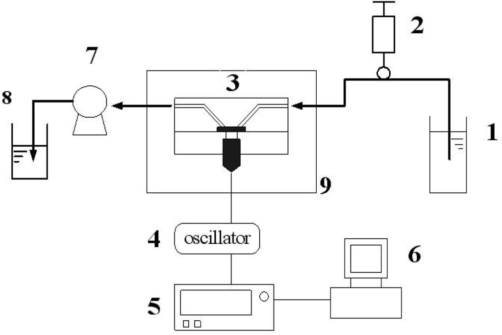 Sauerbrey first described the relationship between frequency shift and mass change on the crystal surface in air [12]. The frequency response of the QCM is also dependent on both the density and viscosity of the solution as a liquid passes over the QCM crystal surface [13]. The QCM device is convenient to use and it rapidly detects in real-time the responses of antigen–antibody interactions on the surface of device [14,15]. Therefore, the low cost and easy operated QCM device has been applied in various biotechnology fields, such as clinical diagnosis [16–18] and environmental monitoring [19].
