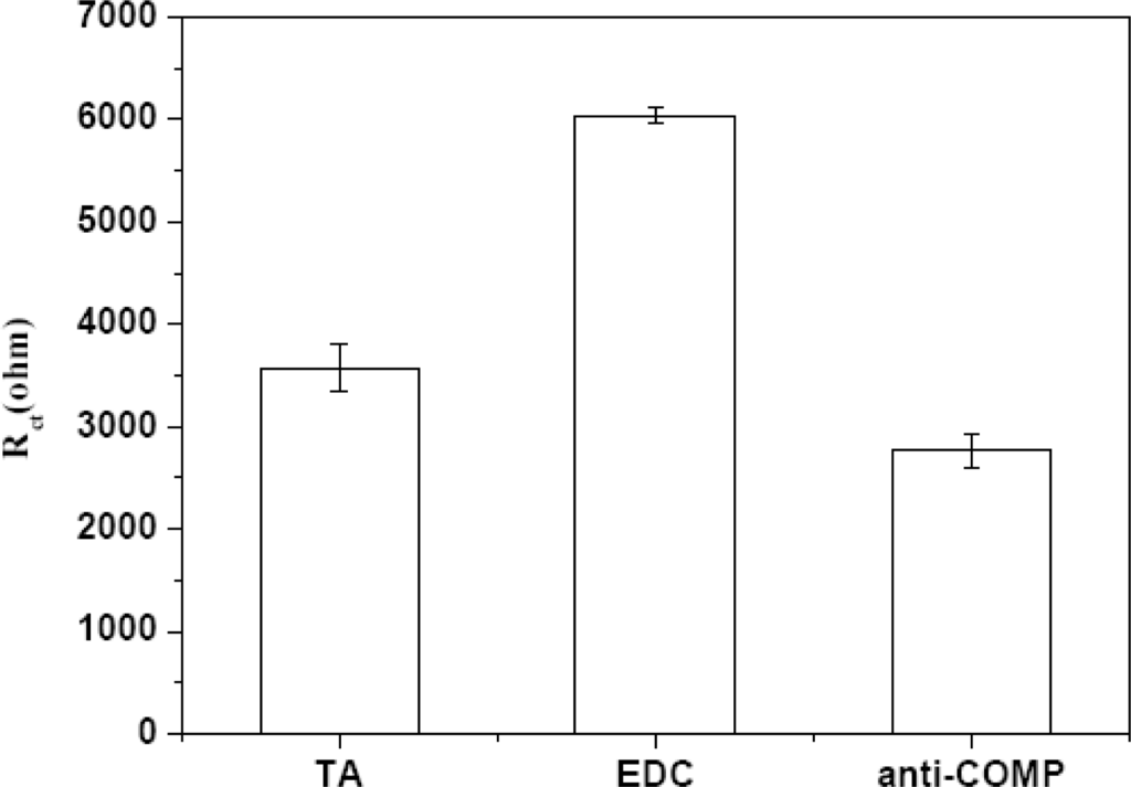 The reproducibility of the modified gold electrodes was evaluated by examining the impedance for each electrode. The impedance of the COMP antibody immobilized electrode and the BSA treated electrode were evaluated by EIS at 30 °C. All electrochemical measurements were performed in a three-electrode electrochemical cell. A screen printed carbon and a screen printed Ag/AgCl electrodes were used as the counter and reference electrode, respectively. A QCM was introduced as the working electrode. A thioctic acid monolayer was formed by the SAMs technique, and then the functional group of TA monolayer was activated by EDC. Finally anti-COMP and BSA were immobilized on modified electrode area successfully. Impedance spectroscopy (EIS) studies demonstrated that the formation of antibody–antigen complexes increased the electron-transfer resistance (Rct) of Fe(CN)63−/4− redox pair at the BSA/anti-COMP/EDC/TA/gold electrode. Figure 3 represents the EIS spectra for different electrodes, and the average impedances for the COMP antibody modified electrode was 2,766 Ω. The relatively low deviation implied that the high reproducibility and high reliability of the electrodes utilizing this SAM immobilization technique.