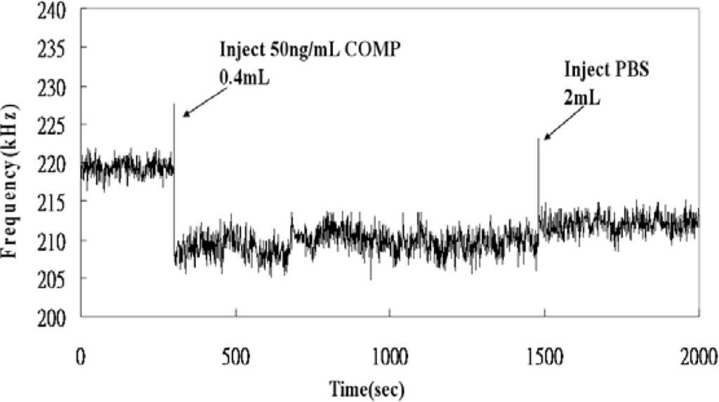 The binding capacity of the proposed QCM immunosensor was examined by detecting various concentrations of COMP. Figure 4 showed the typical frequency responses monitored by the QCM immunosensor for COMP detection at 26 °C. When the QCM immunosensor detected COMP concentration at 50 ng/mL, the frequency response quickly shifted downward from 219 to 213 kHz. The temperature of the sample fluids should be strictly controlled because it can strongly affect the immunological reactions; hence a fluid temperature controller was also incorporated in our QCM device.