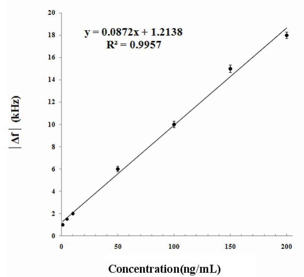 The linear regression equation is y = 0.0872 x + 1.2138 (R2 = 0.9957), where y is absolute value of frequency shift and x is COMP concentration in ng/mL. The frequency shifts were observed in the range of 1–200 ng/mL, which showed the QCM sensors have higher sensitivity and faster response than the ELISA method in the real time detection, thus allowing the possibility of estimating COMP concentrations in unknown samples.