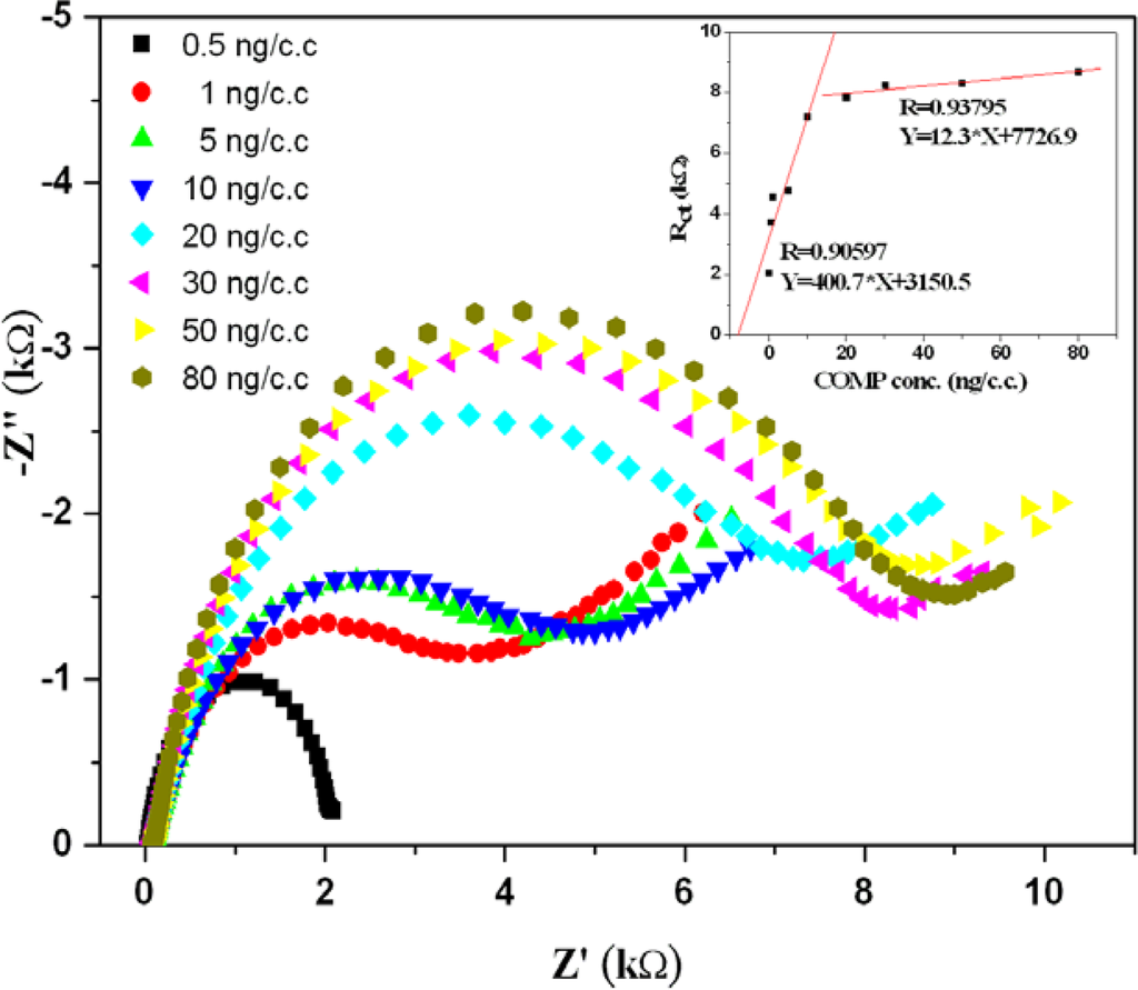 Since the impedance of the electrode was significantly altered by the electrode surface condition, we exploited the EIS technique to detect the COMP concentration. The modified electrodes were immersed in 20 μL of solution with the desired COMP concentration for 5 min and then rinsed with PBS. Due to the different amounts of COMP adsorption, the impedance of the electrodes changed with the COMP concentrations as shown in Figure 6. Impedance spectroscopy (EIS) studies demonstrated that the formation of antibody–antigen complexes increased the electron-transfer resistance (Rct) of Fe(CN)63−/4− redox pair at the BSA/anti-COMP/EDC/TA/gold electrode. Because of the relatively large surface area for EIS analysis, the sensitivity of the electrode was higher at relatively low COMP concentrations. Nevertheless, the operating procedure of EIS is much simpler than the ELISA method and it could therefore be applied as a homecare system.