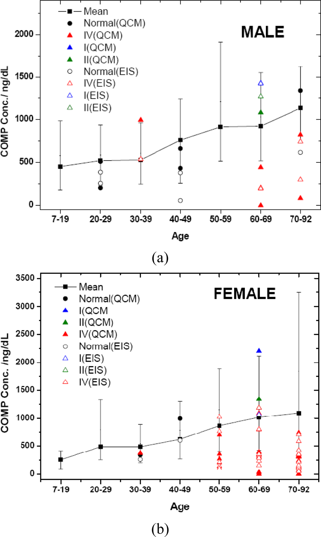 The trends of the results obtained by QCM and EIS were similar. Comparisons of ELISA data, QCM results and the reference values of COMP concentrations [20], showed the COMP concentration measured by QCM and EIS sensor showed results consistent with the traditional ELISA detection. The urine COMP level in patients with grade 1–2 of OA presented higher concentrations than the mean level in normal persons. However, the urine COMP level in patients with grade 4 OA was very low. It was because that cartilage erosion in a patient with grade 4 of OA is very serious, therefore the cartilage was almost decayed and no more COMP was released to be detected. The developed QCM immunosensor provides a rapid and sensitive measure for detecting the presence of COMP, and therefore can be applied to early diagnosis of OA.