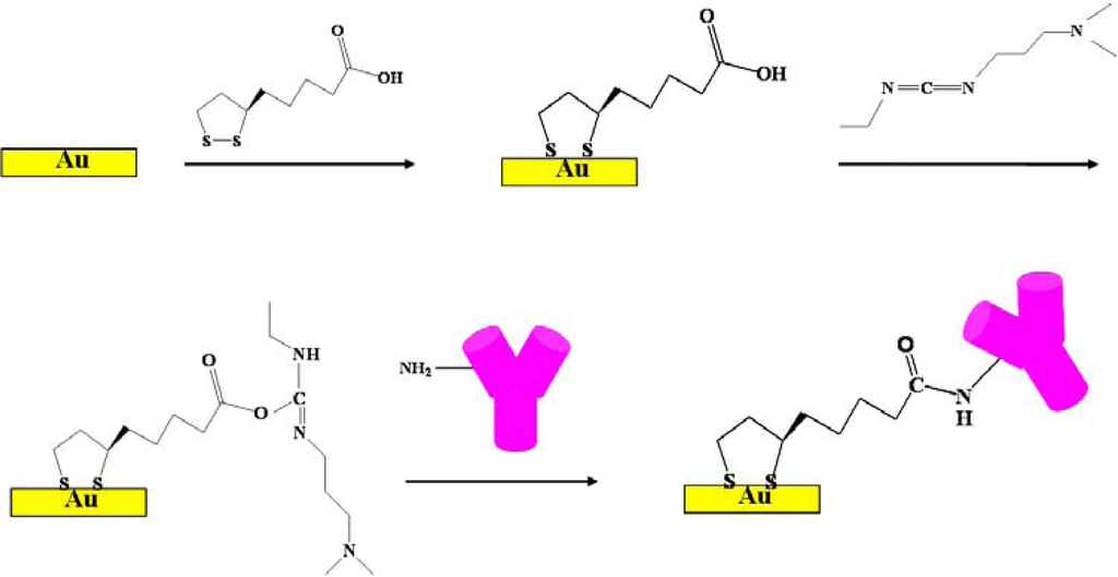 The QCM sensor (Taitien Co., Ltd, Taiwan), coupled inside a flow injection system, was a 10 MHz quartz crystal with a 3.8 mm diameter gold electrode. Each of the gold electrodes was pretreated by electrochemical cleaning in 0.5 M H2SO4 solution using cyclic voltammetry at a scan rate of 100 mV/s for five cycles and then washed in de-ionized water and dried with a light stream of nitrogen gas. The pretreated gold electrode was immersed in the 2.5 mM thioctic acid (TA) alcohol solution at room temperature for 24 h in the darkroom. Afterwards, it was rinsed thoroughly with ethanol and dried with nitrogen gas and stock at room temperature for further used.
