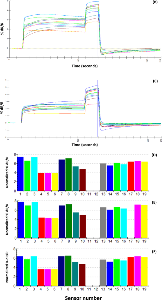 Typical sensor-response outputs from representative samples of healthy wood blocks (controls), inoculated wood blocks (decayed) and wood decay fungi pure cultures. Sensory array output are from: (A) a non-inoculated sample of Quercus lyrata, (B) a partially decayed wood sample of Q. lyrata after inoculation with Ganoderma lucidum, and (C) a sample of Ganoderma lucidum in pure culture. Histograms of normalized intensity responses of individual sensors to headspace volatiles produced by the same Q. lyrata-samples for non-inoculated (D), partially decayed (E), and pure culture (F), respectively.