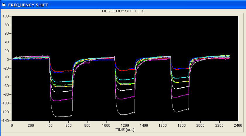LibraNose 2.1 e-nose sensor-array output derived from Ganoderma lucidum-decayed Celtis australis wood block one year after artificial inoculation. Three replication analyses were performed per sample during a 2,400 s run cycle. Notice that there is a complete reversal of sorption of volatiles to the sensors as indicated by frequency shifts at three separate instances during the run.