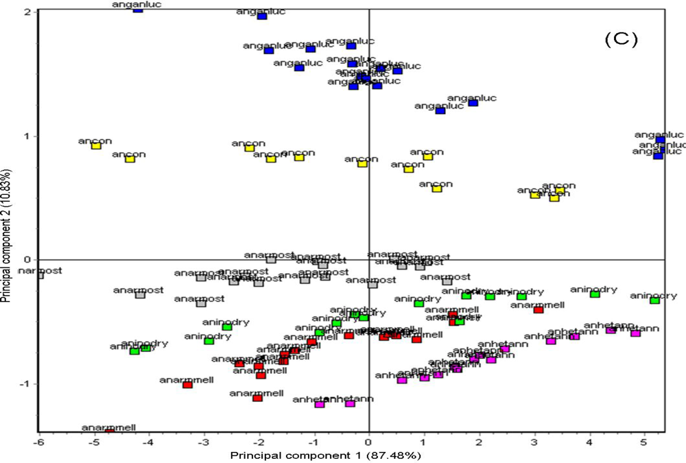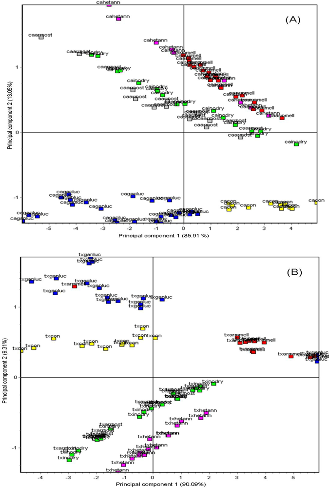 Aroma map plot showing discrimination of volatiles from decayed wood samples of (A) Celtis australis, (B) Tilia spp. and (C) Acer negundo by principal component analysis (PCA) of mean changes in crystal oscillation-frequency (Δf) data. Different color labels1 indicate different wood decay fungi responsible for decay and corresponding headspace volatiles produced. The first two letters of each label indicate specific tree species according to the following abbreviations: ca = Celtis australis; tx = Tilia sp.; an = Acer negundo. The subsequent letters following in the label indicate the wood decay fungus responsible for decaying the wood blocks for 12 months following artificial inoculation: ganluc = Ganoderma lucidum: hetann = Heterobasidion annosum; armmell = Armillaria mellea; armost = A. ostoyae; inodry = Inonotus dryadeus. Con = undecayed or healthy (control) wood blocks.