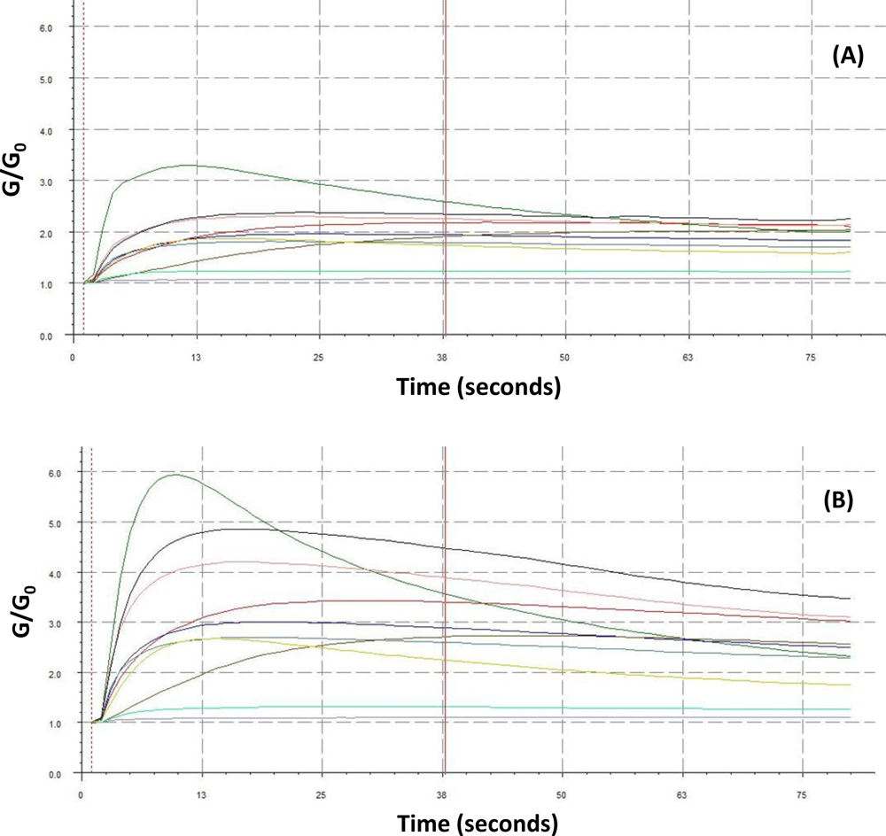 The sampling chamber temperature was set at 30 °C, controlled by thermostatic bath, and atmospheric air was used as the carrier gas. Reference air was preconditioned by passing room air sequentially through an active-carbon filter (Whatman plc, Maidstone, UK) to remove organic compounds, moisture, particulates and microbes. Because sensor conductivity drifted as the sample gas passed over the array, the data were adjusted based on the changing ratio of conductivity between G and G0 (i.e., the electrical conductivity response of the sensors to the sample gas relative to the carrier gas or baseline signal over time).