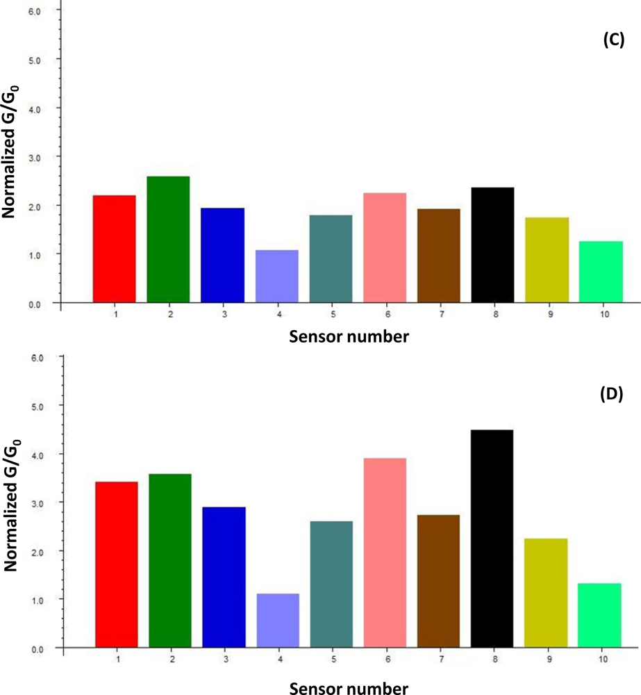 Typical sensor-response outputs from representative samples of healthy wood blocks (controls), and inoculated wood blocks (decayed). Sensory array output from: (A) a non-inoculated sample of Acer saccharinum, (B) and a decayed wood sample of A. saccharinum after inoculation with Armillaria mellea. Histograms of normalized intensity responses of individual sensors to headspace volatiles produced by the same Q. lyrata-samples for non-inoculated (C), and decayed wood (D), respectively. G/G0 is the ratio of the conductivity response of the sensors to the sample gas (G) relative to the carrier gas (G0) over time. The following data were adjusted relative to the carrier gas baseline.