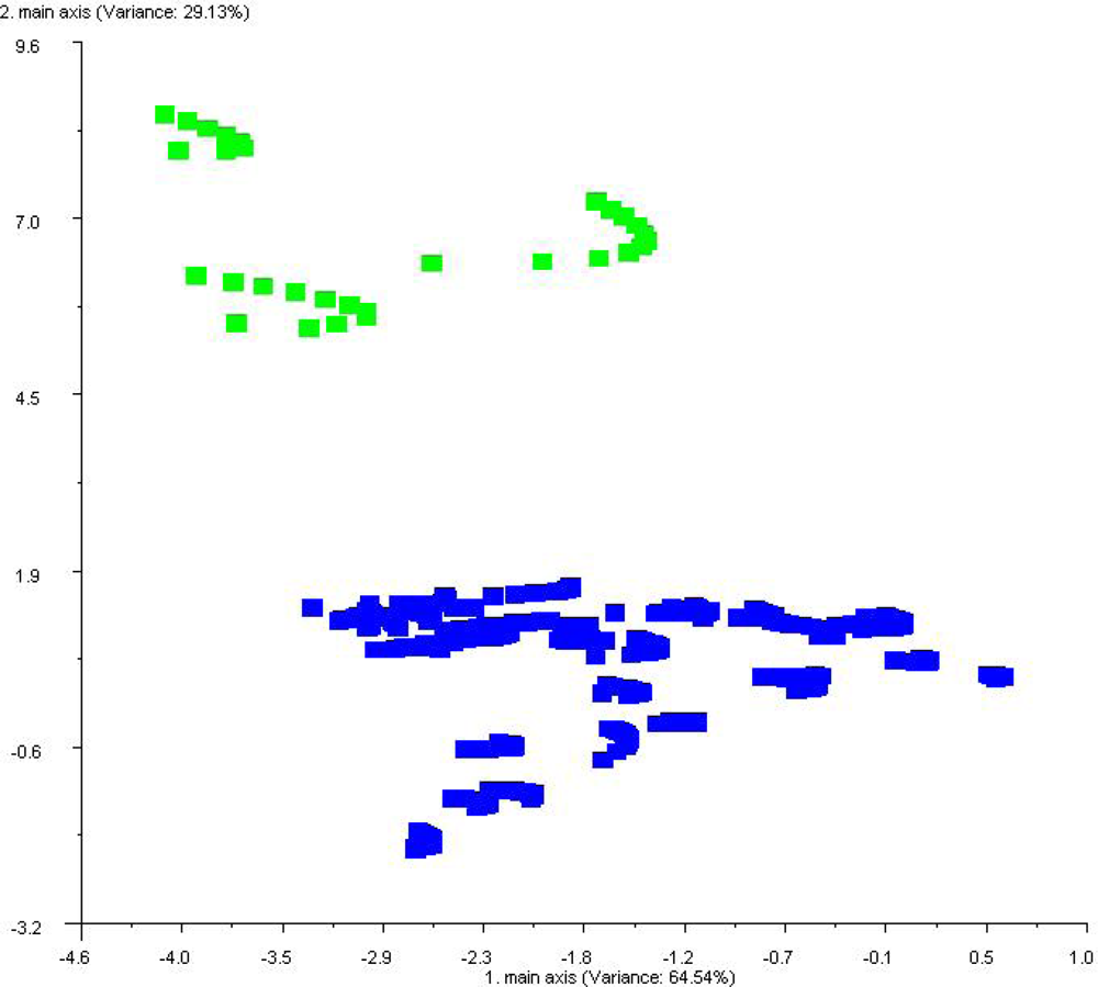 PCA mapping of volatiles from healthy and decayed wood based on statistical differences in standard deviations from the mean (Δσ). Figure 6 provides definitive evidence that uninoculated healthy control samples (green labels) were clearly separated from artificially-inoculated decayed wood blocks (blue labels). PCA analysis indicated that principal component 1 and principal component 2 explained 64.5% and 29.1%, respectively of the sample variance (σ2). Volatiles of healthy control wood samples were clustered in the upper left corner of the plot while decayed samples were clustered in the lower right portions of the 2-dimensional PCA plot.