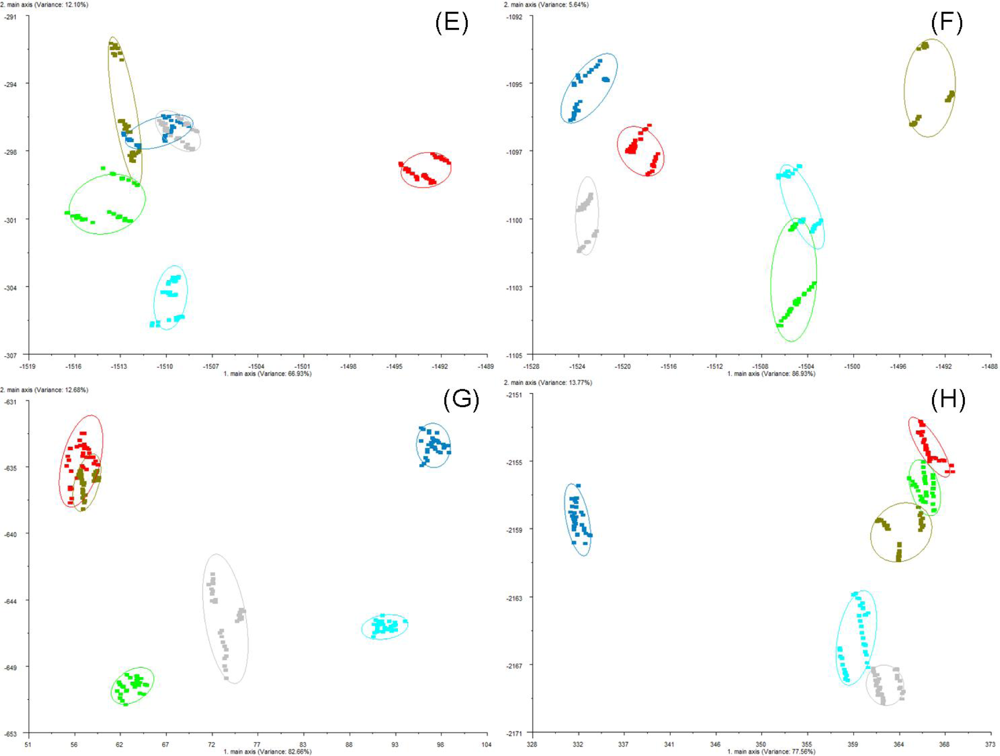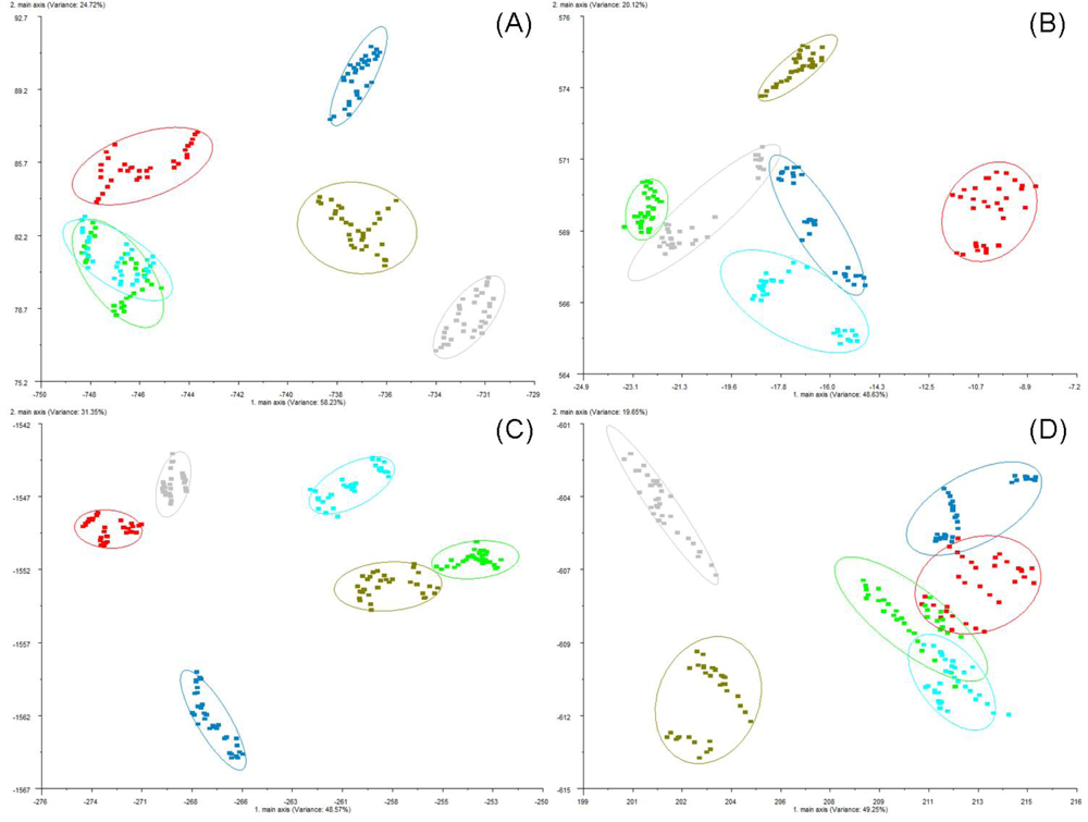 PCA indicated that principal component 1 and principal component 2 explained 85.9% and 13.1% of the sample variance, respectively for the Celtis australis sample plot. The results of PCA tests in the Tilia spp. wood type were quite different (Figure 4B). Ganoderma lucidum-decayed wood samples were more widely scattered and had some minor integration with A. mellea-decayed wood although the bulk of the data clusters were well-separated for these two sample types. Inonotus dryadeus-decayed wood was closely associated with and had significant integrated clustering with A. ostoyae-decayed wood. However, H. annosum-decayed wood and healthy control samples had well-separated data-clustering, indicating effective discrimination from the other sample types. PCA indicated that principal component 1 and principal component 2 explained 90.1% and 9.3% of the sample variance, respectively for the Tilia spp. sample plot.